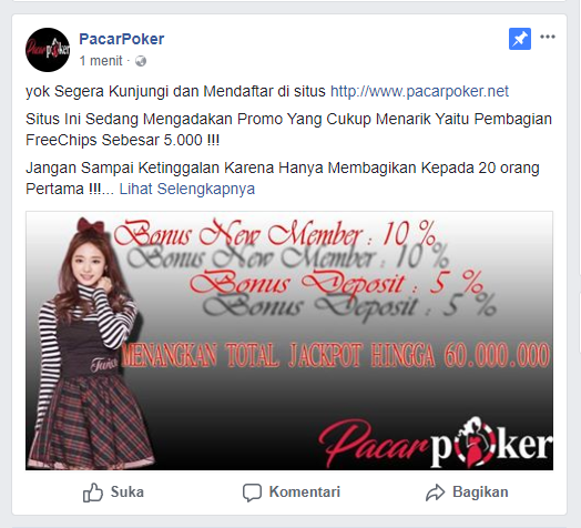 Like Fanpage PacarPoker di alamat berikut : https://www.facebook.com/pg/PacarPokerCom